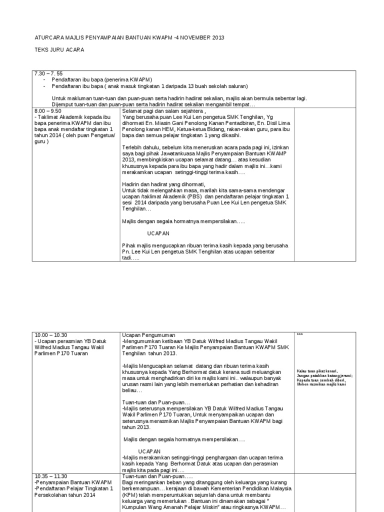 Unit KWAPM Cawangan Bantuan Bahagian Kewangan KPM bagi cetakan resit rasmi Hubungi. TEKS JURU ACARA 730 7. Assalamualaikum wa rahmatullahi wa barakatuh Salam Sejahtera dan Salam 1Malaysia.